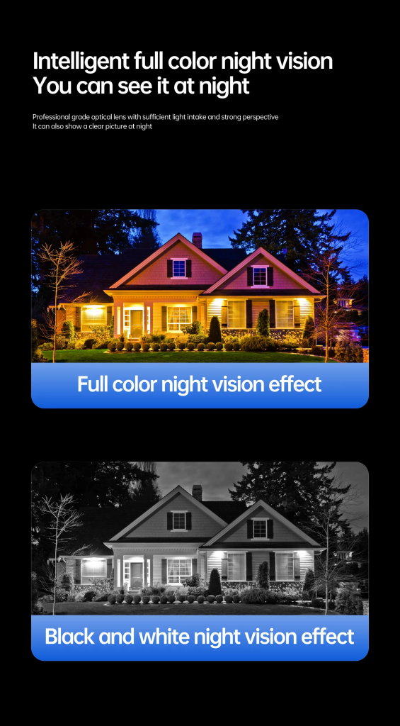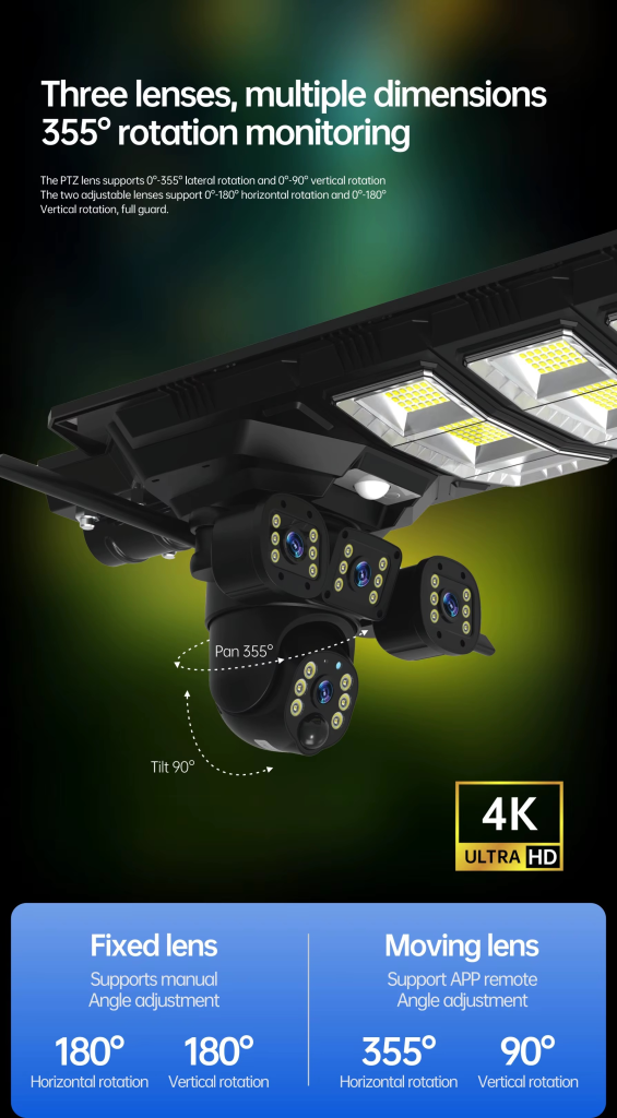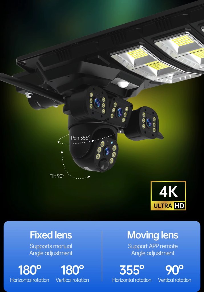 See every angle of your compound, front gate, backyard, and street with 4 lenses + 180° wide-angle view.